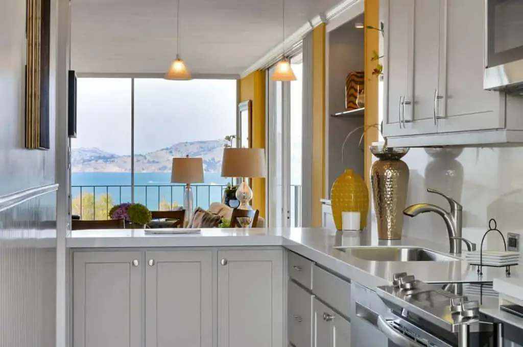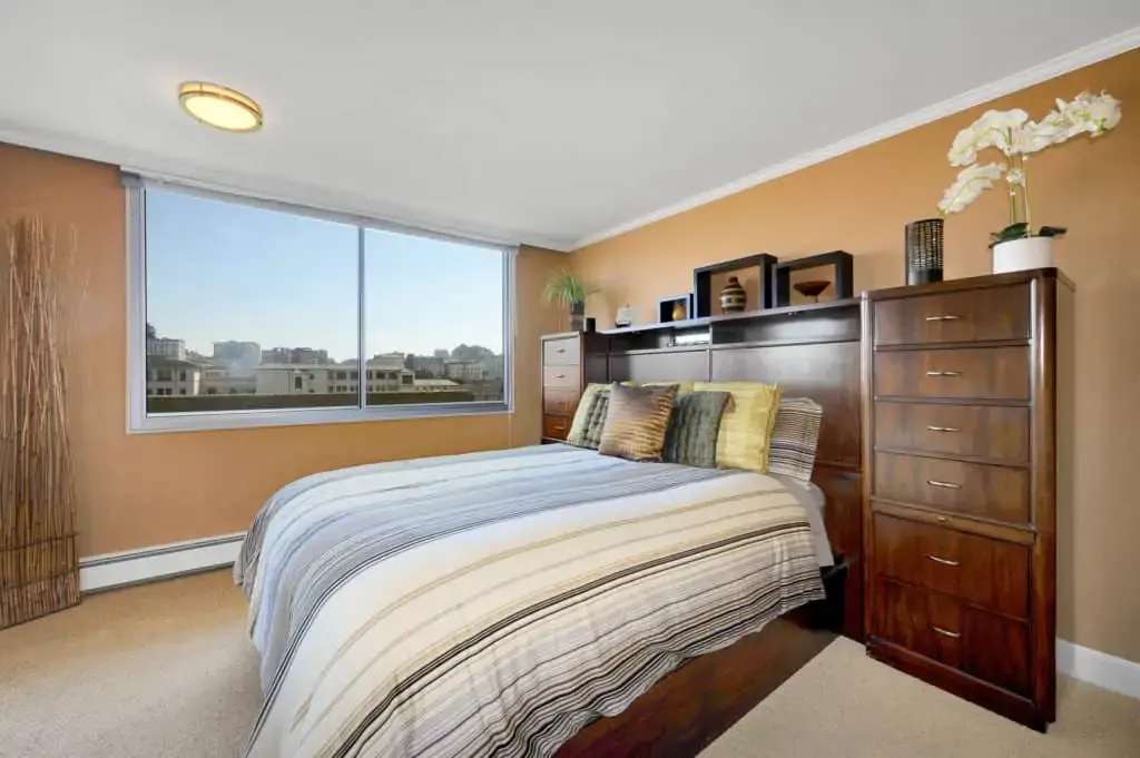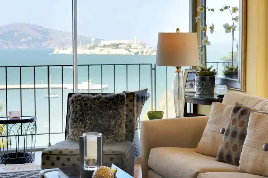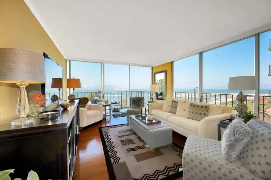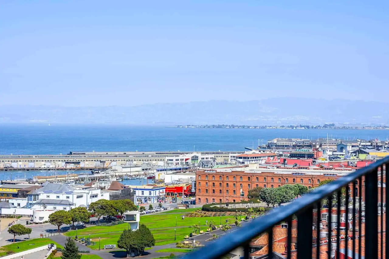 Stunning water views and cityscapes from this cozy corner co-op at the intersection of Russian Hill and The Marina. Available furnished just bring your suitcase and make yourself at home. Wood floors invite you to the open floor plan with 2 walls of windows in the dining/living room with attached deck to drink in the views. The remodeled efficient kitchen offers a breakfast bar and opens both to the living space and to a desk nook at the other end which opens to another deck with views from the Bay Bridge tower, Russian Hill all the way to Pacific Heights. The bath has shower over tub and is easily accessed from both the bedroom and the living space. The bedroom offers wall to wall carpet, a bed with built in drawers and storage, a flat screen TV and a large window with iconic views as well. One car parking and doorman. This is a co-op and board approval is required.